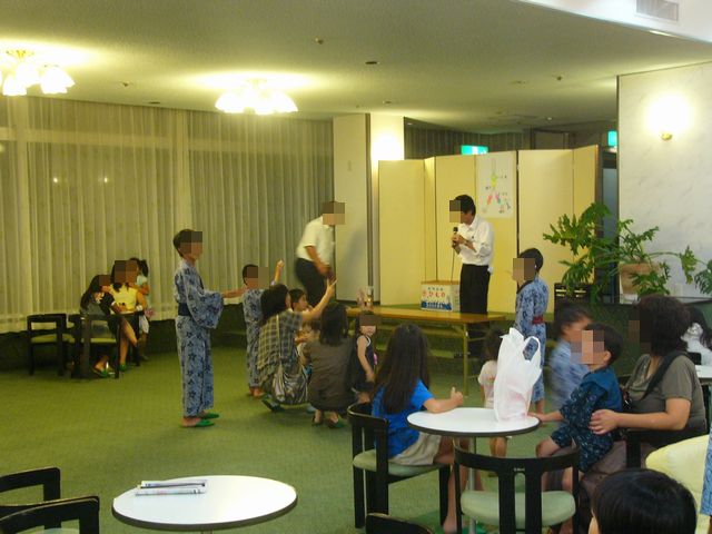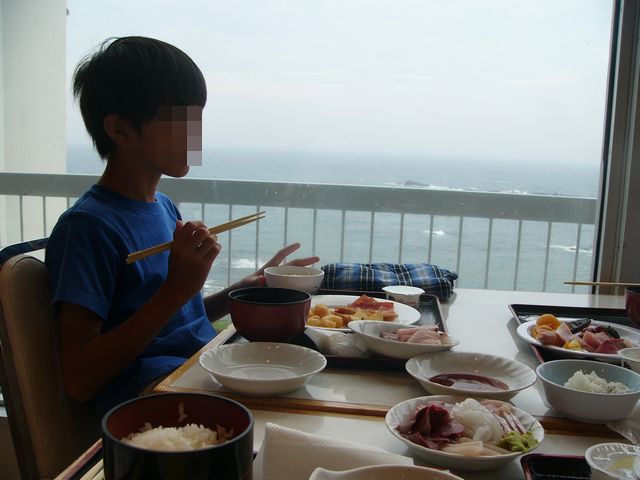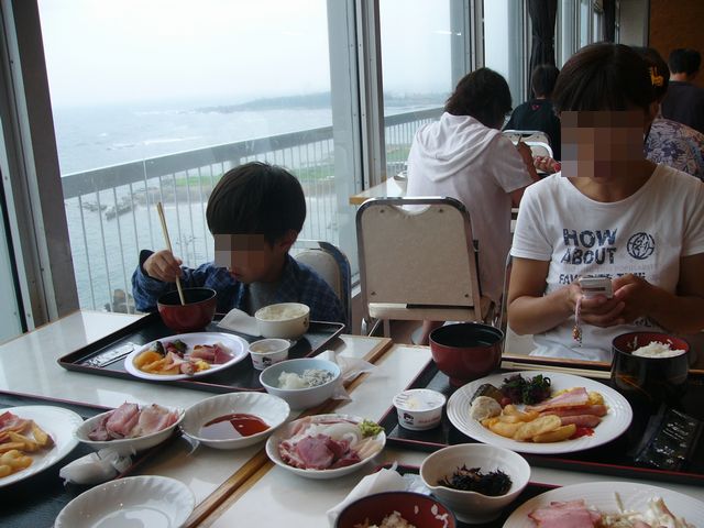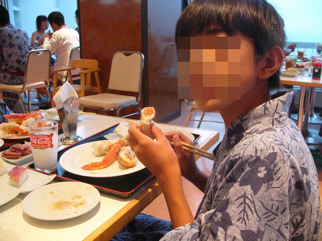 夕食は、定番のバイキングです。子供は、カニやステーキを食いまくり…